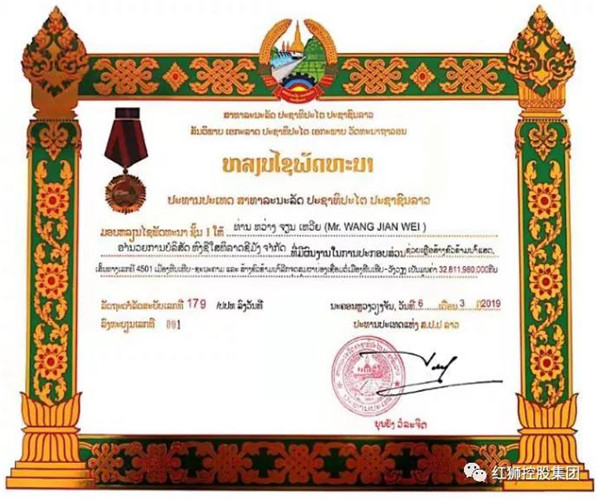 由老撾國家主席簽發(fā)的“國家一級發(fā)展勛章”證書