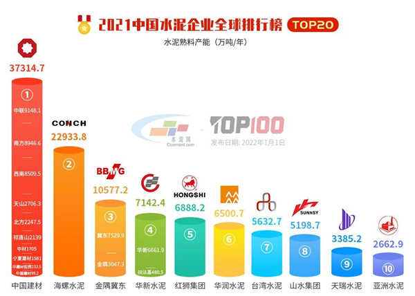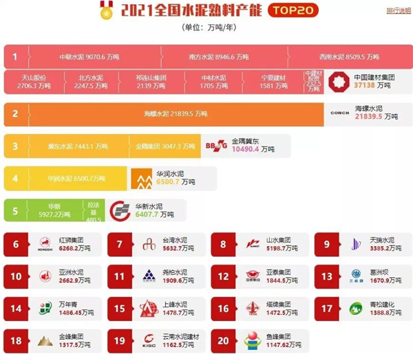 “2021全國水泥熟料產能百強榜”:前二十生變“2021全國水泥熟料產能百強榜”前十沒有出現變化,排名依次為:中國建材、海螺水泥、金隅冀東、華潤水泥、華新水泥、紅獅集團、臺灣水泥、山水集團、天瑞水泥、亞洲水泥。排名10-20出現了變化:萬年青、上峰水泥、云南水泥建材排名上升,分別為第14名、第15名、第19名。