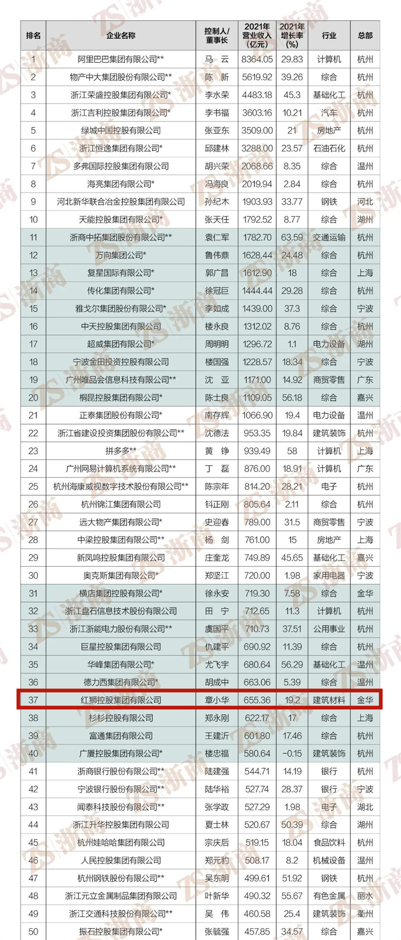 浙商雜志發(fā)布“2022浙商全國(guó)500強(qiáng)”榜單,紅獅集團(tuán)列37位