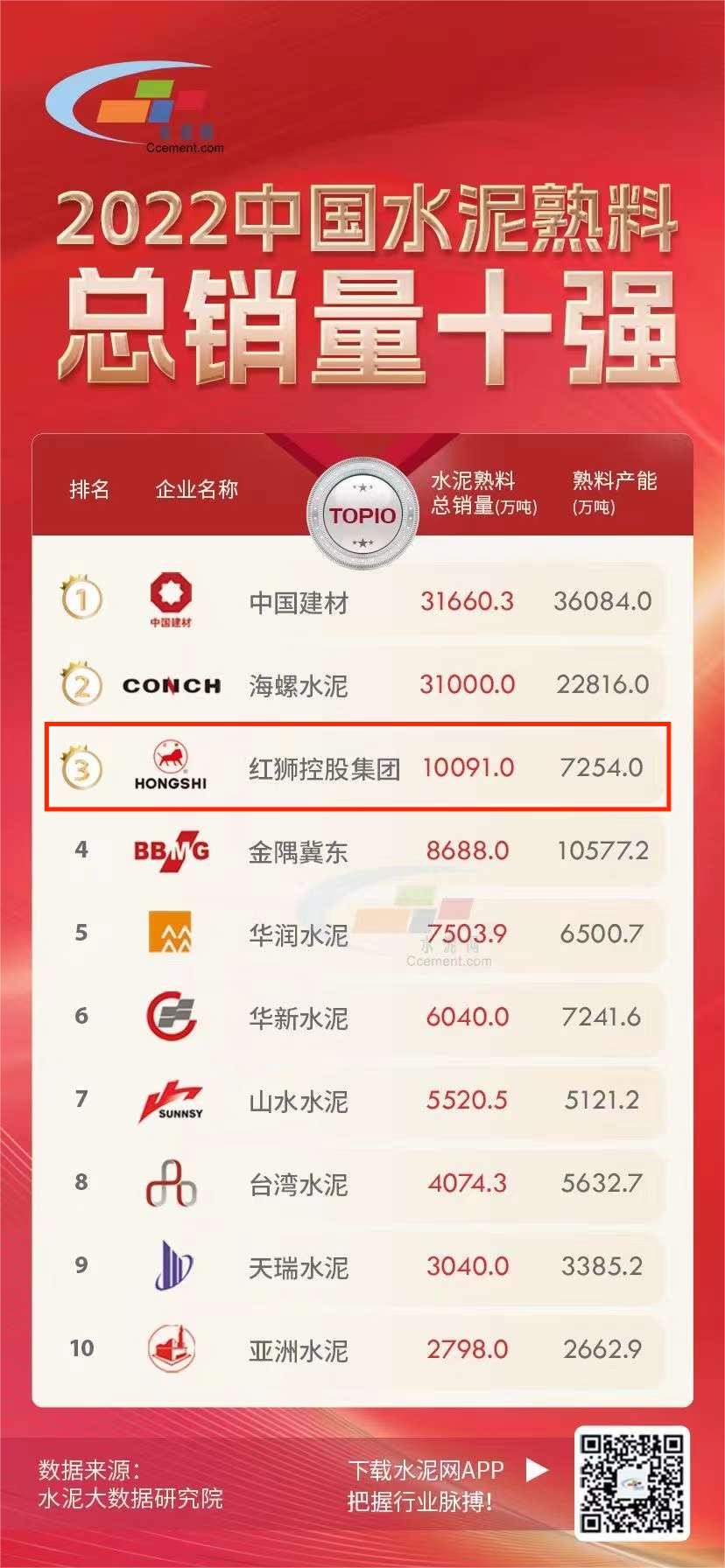 近日,中國水泥網水泥大數據研究院發布2022中國水泥熟料總銷量十強榜單,紅獅集團以總銷量10091萬噸位居第三。