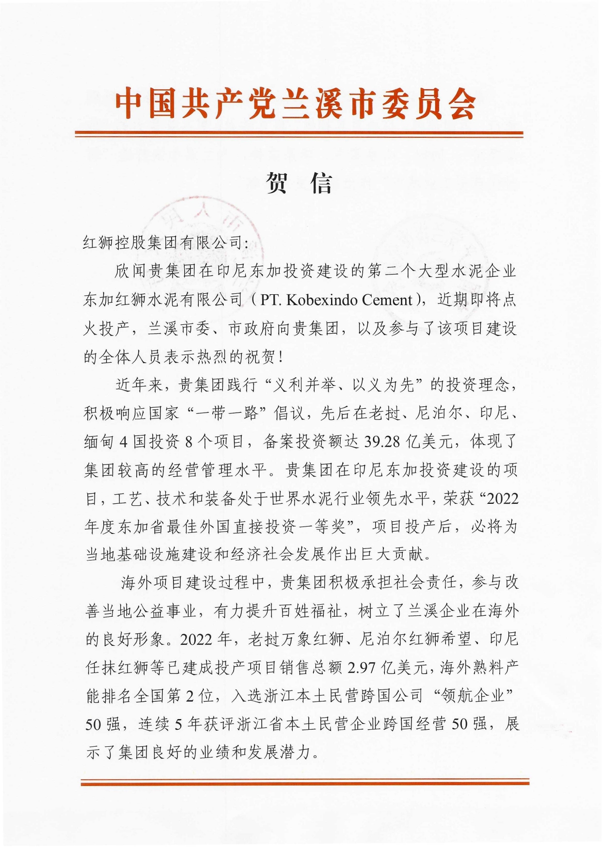 蘭溪市委市政府向紅獅集團印尼東加紅獅水泥項目點火投產發來賀信