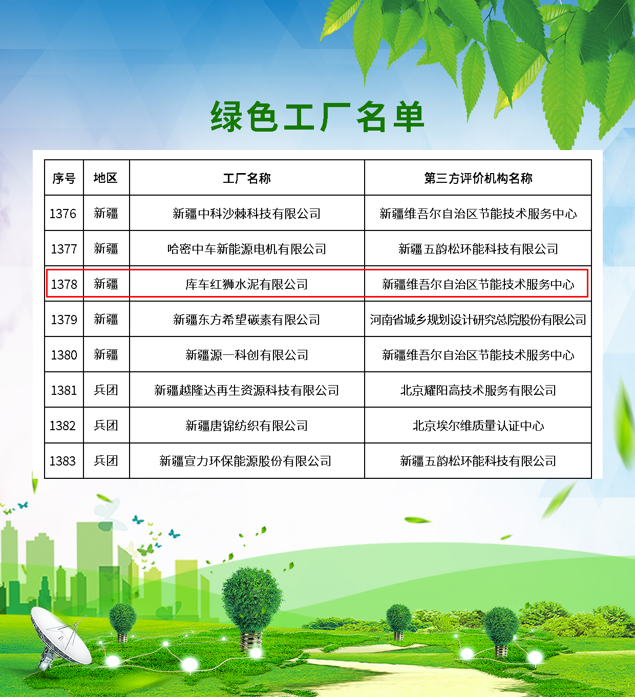 1月5日,工業和信息化部辦公廳下發《工信廳節函〔2023〕384號 工業和信息化部辦公廳關于公布2023年度綠色制造名單及試點推行“企業綠碼”有關事項的通知》,公布2023年度“國家級綠色工廠"名單,庫車紅獅水泥有限公司上榜。