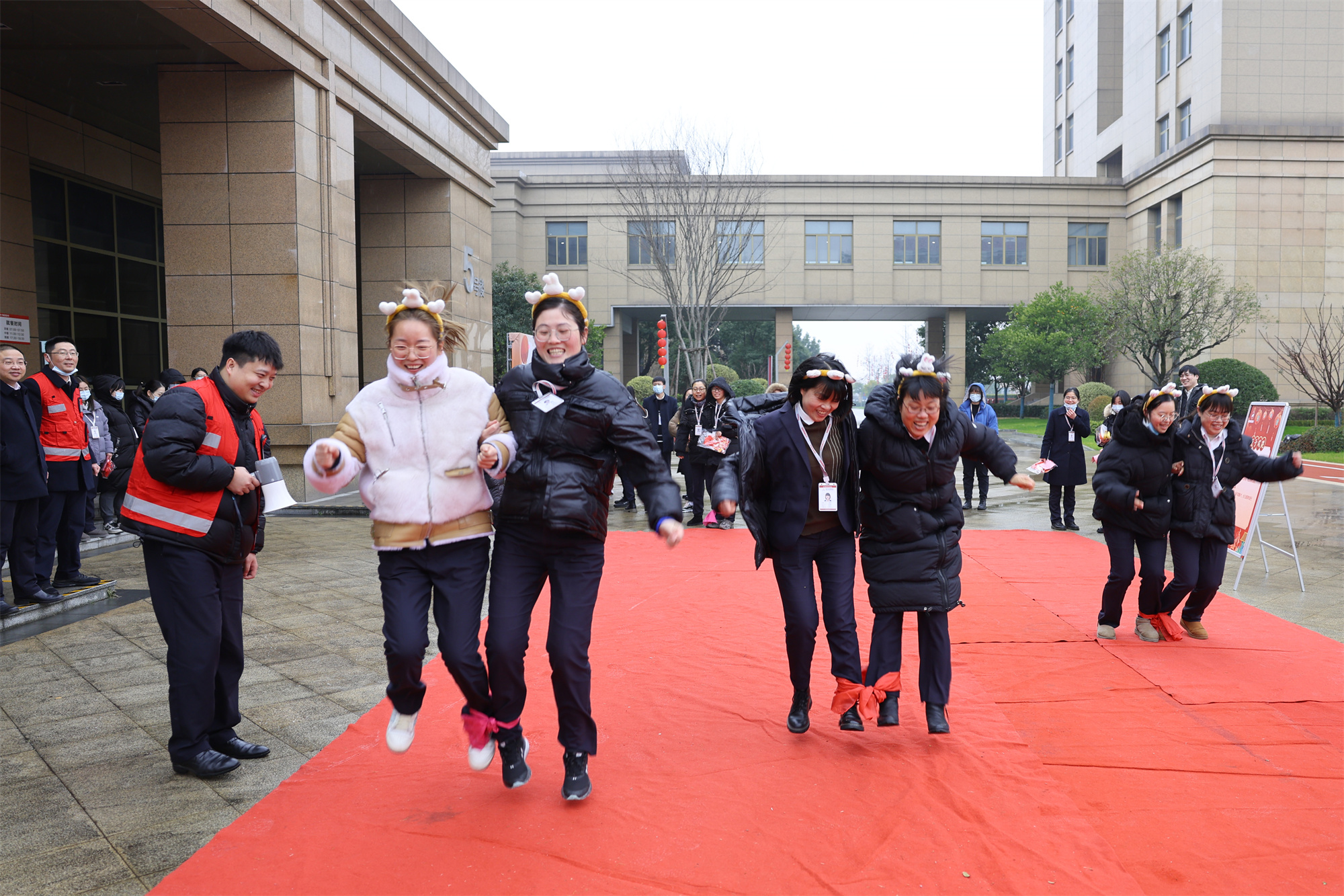 當(dāng)日立春恰逢時(shí),兔歲健步馳千里。戴上兔子發(fā)箍,以兩人三足形式進(jìn)行跳步前進(jìn),起步、跳躍、速度是被綁在同一條繩上三組不同參賽者顯而易見(jiàn)的表現(xiàn),運(yùn)動(dòng)與默契的比拼更能體現(xiàn)兩人配合度與迎兔年的喜悅。