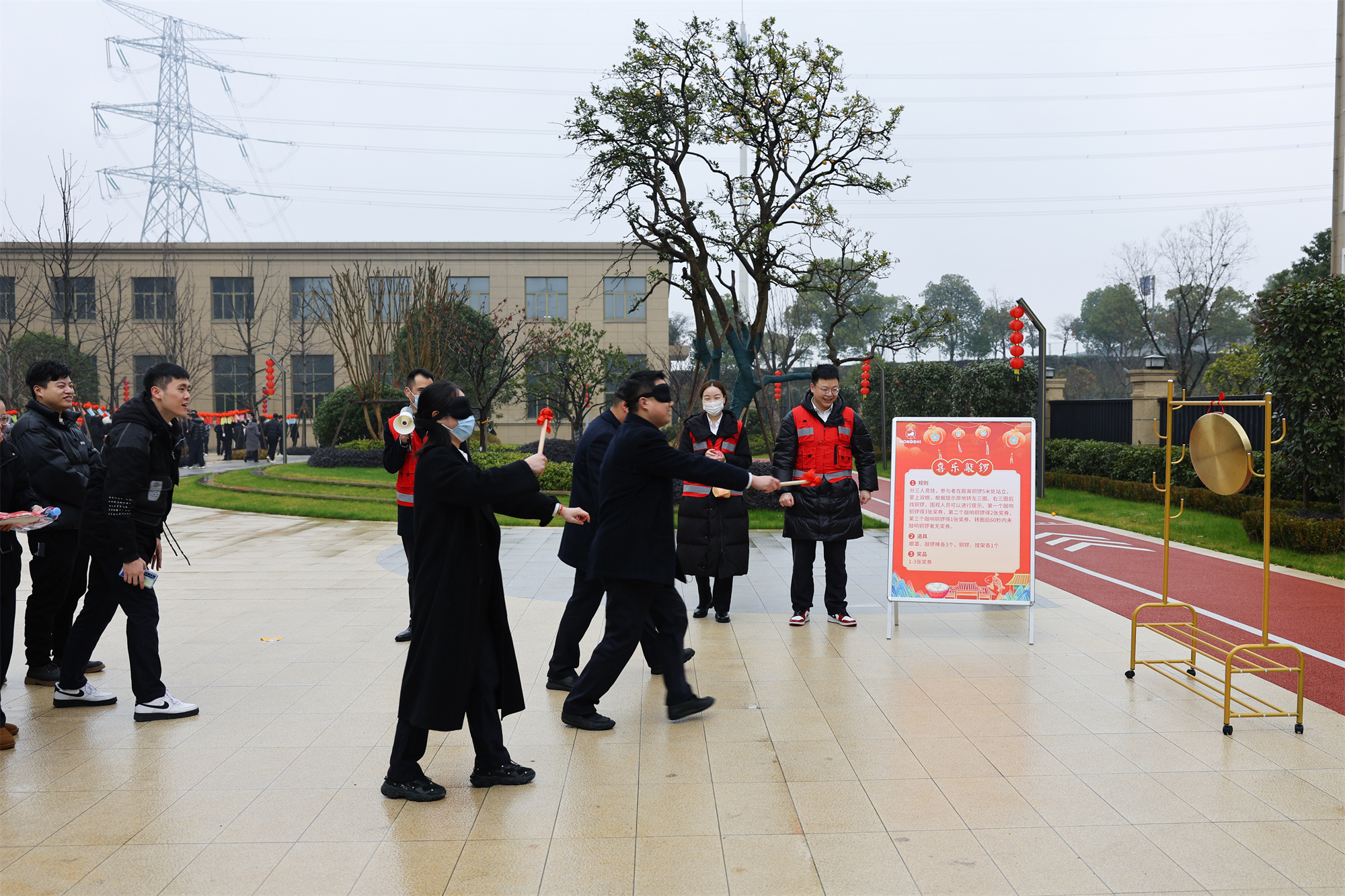 左三圈、右三圈,蒙上眼睛向前沖,銅鑼被一聲聲敲響,那便是平衡與感官的指引,當(dāng)然也不乏同事們善意的提示,第一個(gè)敲響鑼鼓的與走到其他方向的參與者也都收獲了相同的歡呼與笑意。